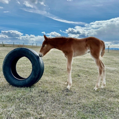 Born April 22, 2024 Lyra arrived at the height of a Lyrid meteor shower that was taking place in the Alberta sky. Courageous, athletic, and beautiful. Not only did she get a sorrel coat from her dad – Arizona Outlaw’s McLaren – within the first day of life, she showed us her strength, independence, and her curiosity. She continues to be constant source of joy around the ranch, and we are excited to watch her grow. For now, she is living in luxury with her mom Destiny and wants for nothing….well… maybe a brother or sister to play with would be perfect! She will have to wait and see what August brings.